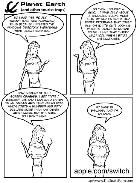 The site apple.com/switch has (or had, depending on when you read this) several of the commercials available in Quicktime format. They're quite amusing (Ellen Feiss' and Janie Porche's are both incredibly annoying. Ellen doesn't save her work and Janie doesn't realize that several versions of Windows features plug and play technology). They're all basically pretty much what Shaunna is saying: idiots buy Macs.