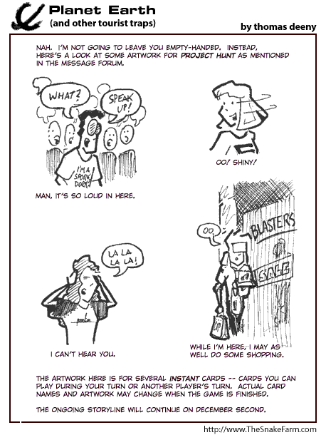 I had been (and still am) working on a card game based on the comic. Featured this week is preliminary artwork from the playtest deck. Several, if not all of these card names are no longer in the game.