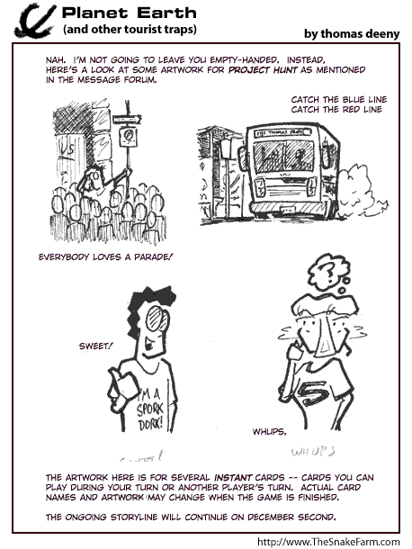 I had been (and still am) working on a card game based on the comic. Featured this week is preliminary artwork from the playtest deck. Several, if not all of these card names are no longer in the game.