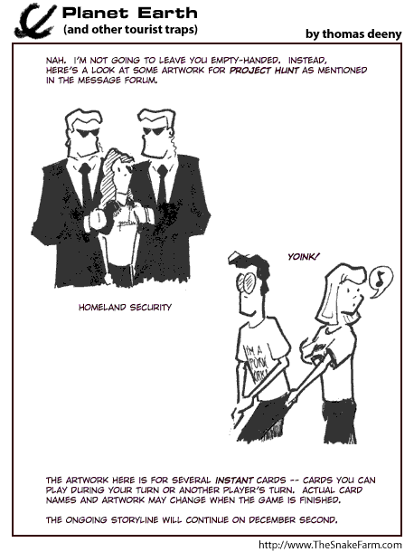 I had been (and still am) working on a card game based on the comic. Featured this week is preliminary artwork from the playtest deck. Several, if not all of these card names are no longer in the game.