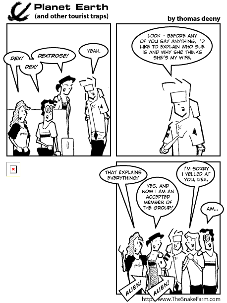 This strip was published a day and several hours late. As it really set up the next strip (and reading the next strip first really would have made this strip less funny), I decided to delay that strip by an extra day. This pushed that Friday's to Sunday, but then it probably was published on Monday. Hopefully, by the time you're reading these commentaries, the strip is back on schedule, but I'd really doubt it.