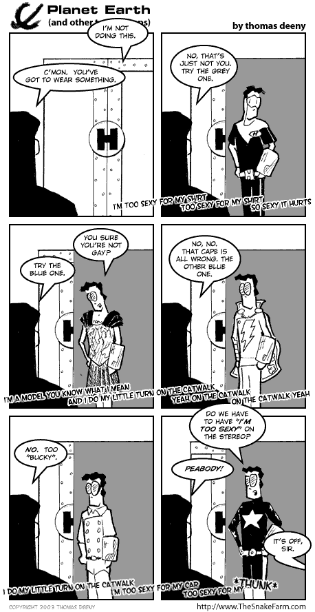 Panel three features Maximus Whatshisnameus' armor from Gladiator (of which the porn takeoff has the best ever porn movie title version of a real movie title: 'Glad He Ate Her'). Panel four is Captain Marvel, Jr.'s uniform (which is blue, not red, like the original Captain Marvel). The "too Bucky" costume is Bucky Barnes', Captain America's WW2 sidekick (plus in a few different eras, but I'm not one to talk about the various 'replacement' Captain Americas). The last costume is the current-most incarnation of the Star-Spangled Kid (female this go around). The original SSK was a bit of an oddity -- instead of an adult hero with a pre-teen sidekick, he was a pre-teen hero with an adult sidekick -- his butler ("Stripesy"), if memory serves me correctly.