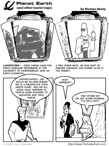 Landstorm, back in the Champions game, was just a guy who could control the earth. The actual "landstorm" was a localized eruption he could create if he ever put both his hands on the ground. In the game, he was paired with Flora, sort of a Poison Ivy/Chlorophyll Kid villain. She was going to show up in this storyline, but was left out when I realized that Landstorm was trouble enough for our heroes.