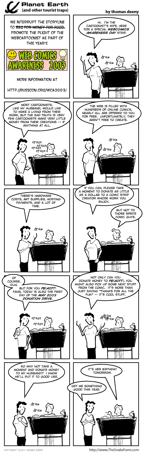 This comic is part of the 2003 Webcomics Awareness Day celebration. You can view the dozens and dozens of other strips that celebrated WCA at the WCA hub page: http://russcon.org/wca2003/. A big thanks to Jim Alexander of Algernon's Dilemna and Russ Williams of Ko Fight Club for their work in getting this year's WCA up and running.
