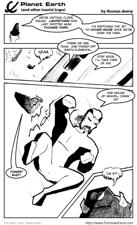 The thought behind the hero storyline was when the strip focused on the heroes doing heroic things, the panel layout would start being a bit more dynamic, like it is here.