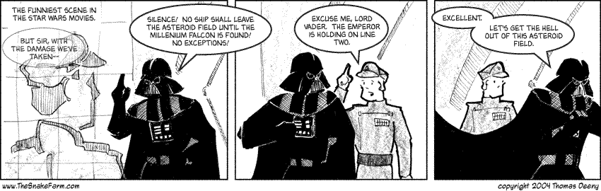 Just before this exchange is the funniest visual gag in the series. A generation of viewers that have only watched the pan and scan version or the television broadcasts never saw it. There's an establishing shot of the Imperial Star Destroyers in the asteroid field and one large rock goes slamming into the bridge tower of one of the ISDs in the foreground. Cut to Vader talking to three of his admirals. The one on the far left looks up to his left and screams as his image flickers out.